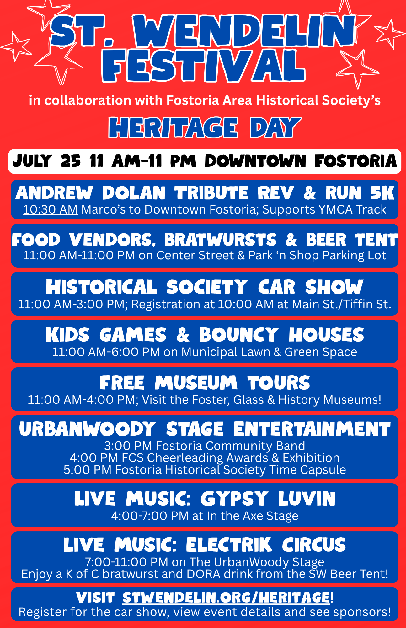 The St. Wendelin Beer Tent will be open to serve from 11:00 AM-11:00 PM. All of the Heritage Day/St. Wendelin Festival activities take place inside Fostoria's DORA boundaries so attendees are able to meander through all the many organizations setup throughout the day!